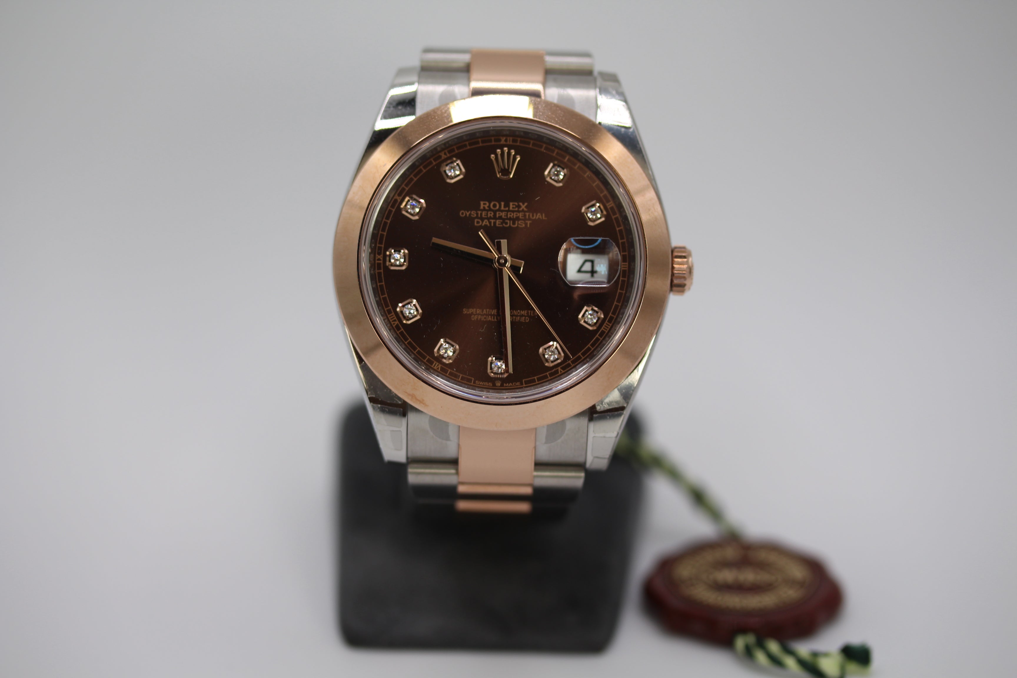 Das besondere Highlight: ein chocolat-braunes Zifferblatt, geschmückt mit funkelnden Diamant-Indizes. Eine Konfiguration, die man nicht oft sieht – und die jeden Blick auf sich zieht.
